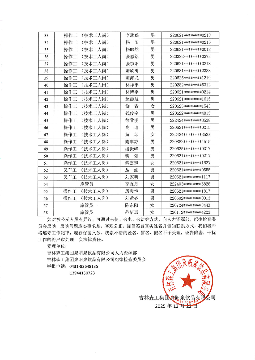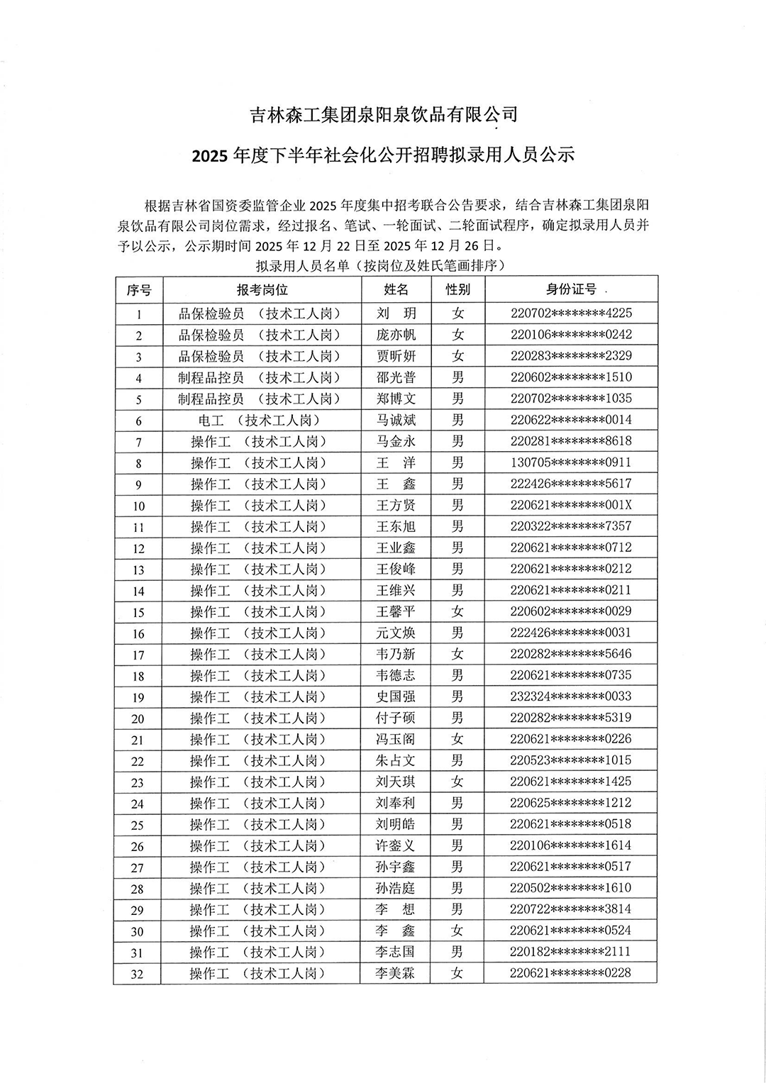吉林森工集團(tuán)泉陽(yáng)泉飲品有限公司2025年度下半年社會(huì)化公開(kāi)招聘擬錄用人員公示
