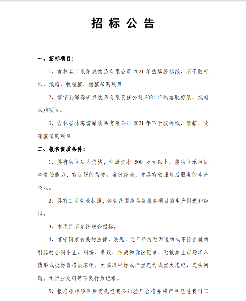 2021年度熱熔膠標紙、不干膠標紙、紙箱、收縮膜、桶膜招標公告