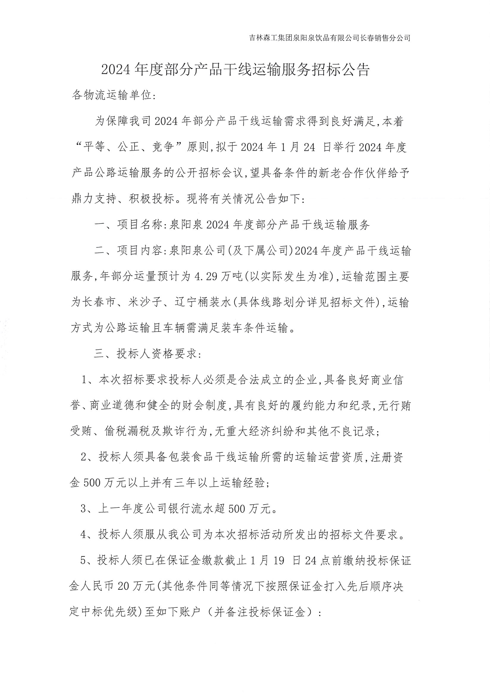 2024年度部分產(chǎn)品干線運(yùn)輸服務(wù)招標(biāo)公告